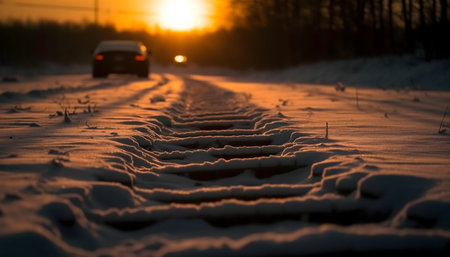 Snowy road at sunset, car driving away. Beautiful winter scenery.
