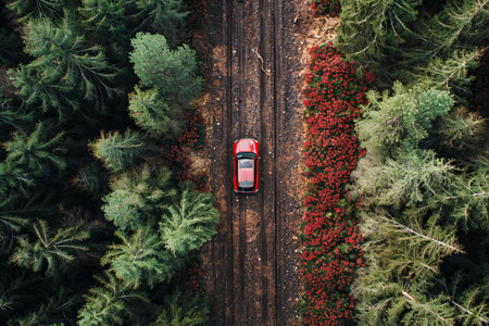 Digital artwork of aerial view of a red road car in forest, high quality, high resolution