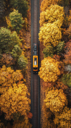 A train races through a vibrant autumn forest filled with golden leaves, showing the dynamic seasonal color change in a breathtaking aerial perspective.