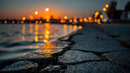 An image captures cracked pavement in sharp focus, extending toward a body of water reflecting the soft glow of sunset. The background reveals blurred city lights, suggesting an urban environment at dusk. This photograph's composition and color palette lend it to diverse applications, including artistic projects and editorial content.
