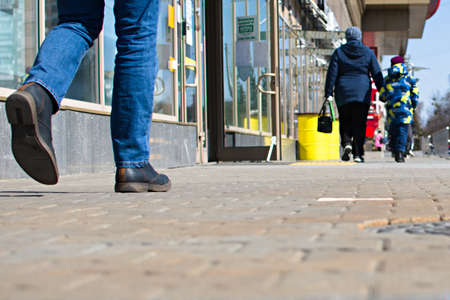 Ukraine Zhytomyr March 24, 2021. Legs of a man in blue jeans and boots walking on sidewalk against backdrop of cityscape