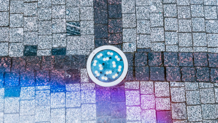 Abstract background with cobbled street tiles and LED lamp. Wallpaper of pavement with color pink blue toning. Cross. Geometric urban scene. Soft focus. film grain pixel texture. Defocused.