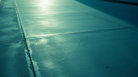presents a close-up view of a cracked concrete pavement. The surface is marked by distinct lines and seams, with visible cracks running through the grey Bright sunlight illuminates the scene, casting long, sharp shadows that create a strong geometric pattern across the pavement. The texture of the concrete is rough and gritty, showing signs of wear and age. The overall impression is one of an urban outdoor environment under harsh light.