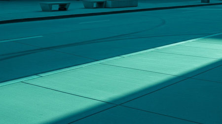 An urban scene captured from a low angle, focusing on a concrete sidewalk and the edge of an asphalt road. The entire scene is bathed in a striking teal light, creating a cool, monochromatic palette. Strong geometric lines define the pavement and the edge of the road, with a sharp shadow cast diagonally across the sidewalk. Subtle tire marks are visible on the road surface. The overall impression is one of quiet, modern urban geometry under an unusual, atmospheric light.