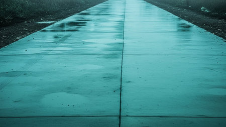 A wet concrete road, marked by distinct lines and scattered puddles reflecting the muted teal sky, stretches into a foggy, indistinct distance. The surface of the road appears textured and worn, with tire tracks faintly visible. The overall atmosphere is moody and somber, with the fog and overcast conditions creating a sense of desolation and mystery. The color palette is dominated by muted blues and greens, enhancing the tranquil yet eerie feeling.