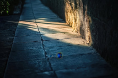 A stone pathway receives warm sunlight while shadows stretch along the surface during the afternoon.