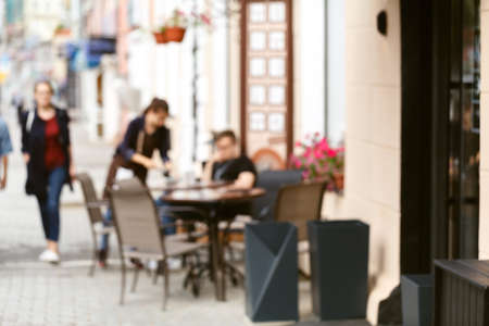 Outdoor cafe terrace with people walking in the city. Selective focus.