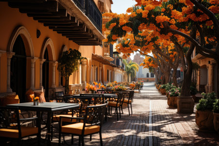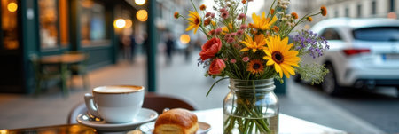 Cozy cafe ambiance with flowers and coffee on a city street. That the image is generated using AI.