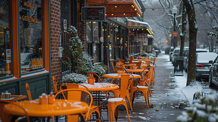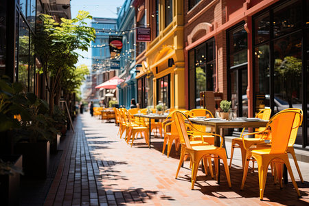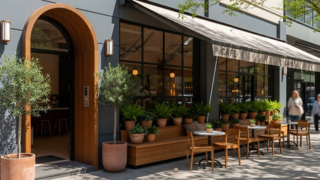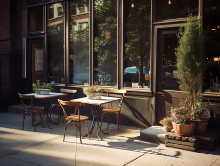 Charming Cozy Outdoor Cafe with Empty Tables and Greenery on a Bustling Urban Sidewalk