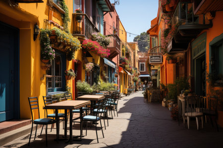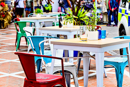 Colorful tables and chairs at a street cafe in Mojacar, AlmerÃa, Spain