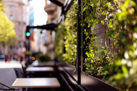 Green hedge on café street, climbing plants on metal frame, natural fence, and eco-conscious city dining area.