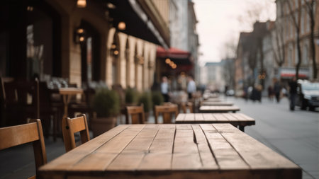 Empty wooden table and chairs in a street cafe, shallow depth of focus