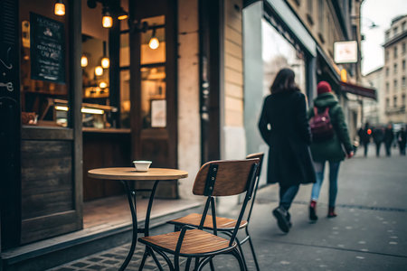 Cozy city cafe with vintage furniture, small tables and inviting street style