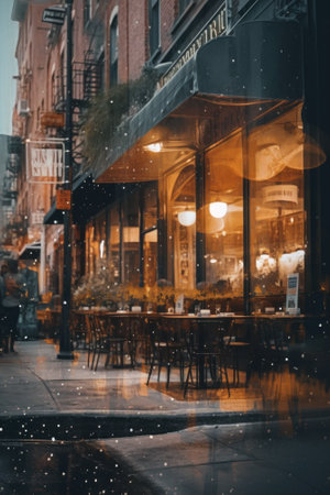 A city cafe glows warmly as dusk sets in, its windows offering a peek into the social hub where coffee and conversation flow.