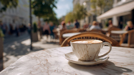 Cup of coffee on a table in a street cafe. Selective focus.