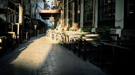 Close-up view of outdoor cafe tables in a quiet alley in Tbilisi, Georgia, bathed in soft morning light and shadows, showcasing the calm elegance of early city life