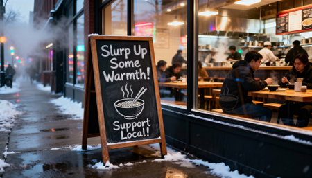 Chalkboard sign outside a cozy restaurant reads Slurp Up Some Warmth! Support Local! with a steaming bowl illustration. Snow-covered sidewalk and warm interior ambiance visible.
