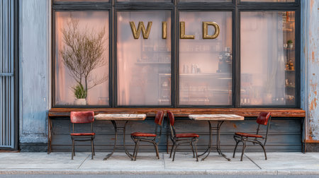 Several tables and chairs sit outside a cafe. The window has a sign that reads Wild. The setting is urban, and it is daytime with natural light.