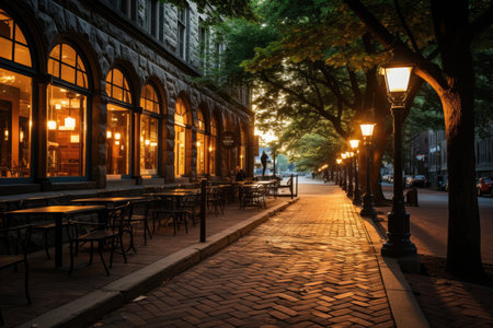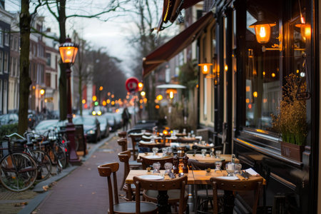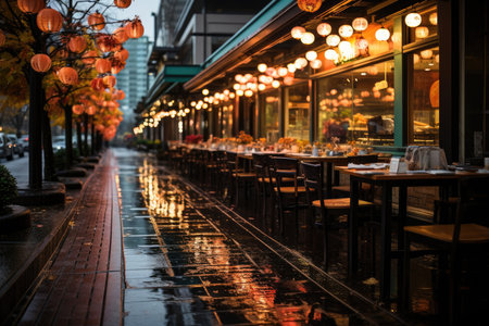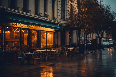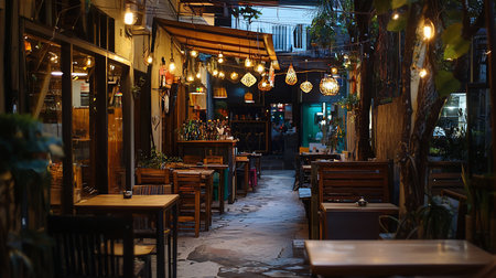 Charming Street Cafe with Cozy Patio Seating and Ambient Lighting in a Vibrant Urban Setting