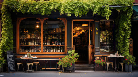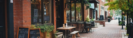 Cafe storefront with outdoor seating, modern urban setting, stone pavement
