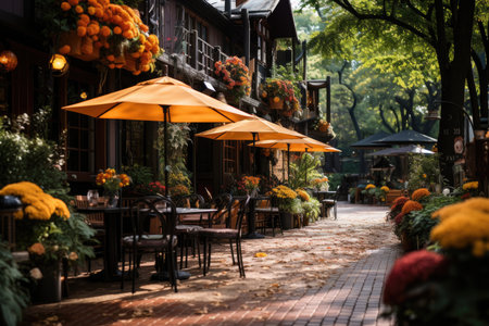 Picturesque outdoor coffee with tables and umbrellas., generative AI