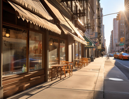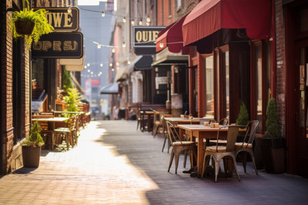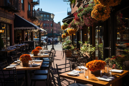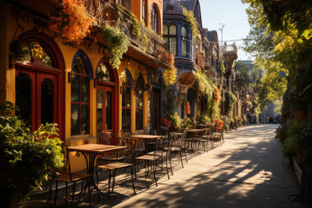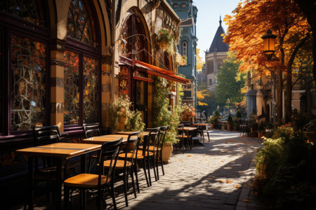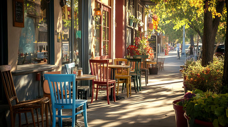 Sunny outdoor cafe autumn morning empty tables cozy atmosphere string lights tree lined street inviting peaceful urban setting
