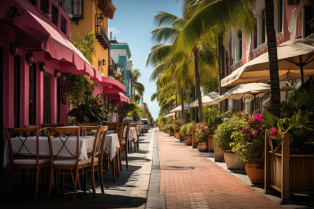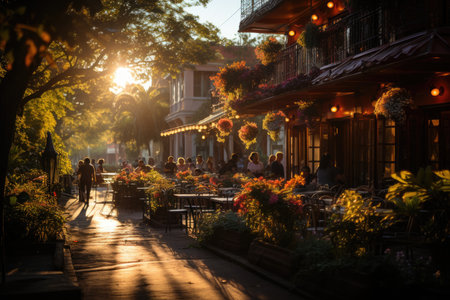 Vibrant city street in a food lover's paradise, brimming with outdoor cafes AI generated