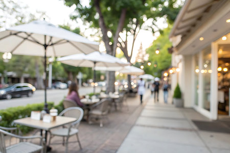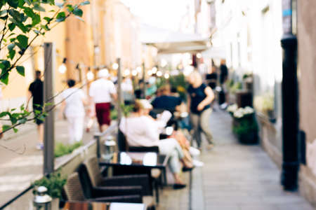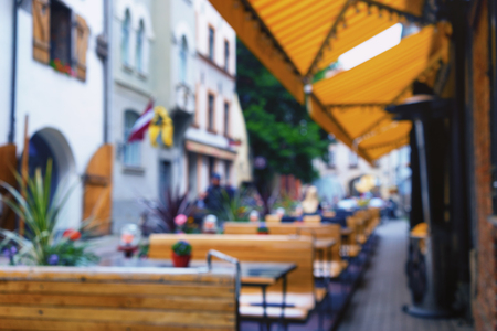 Blurred background of outdoor restaurant with abstract bokeh light. Tables and chairs outside in natural bokeh, summer time, old town. Customers sitting at street cafe