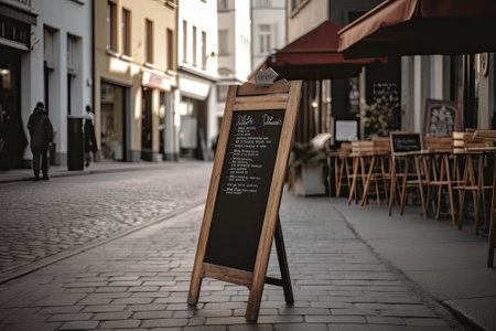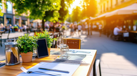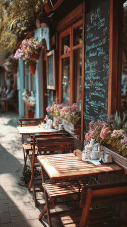 Outdoor cafe wooden table flower pot chalkboard menu sidewalk seating rustic cozy sunny daytime European street