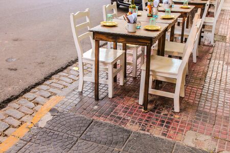Street cafe with tables and chairs. Cozy outdoor cafe. Dinner plate setting.