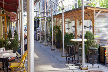 New York, NY, USA - May 17, 2021: Outdoor dining on both the sidewalk and street with a small passage left on the sidewalk