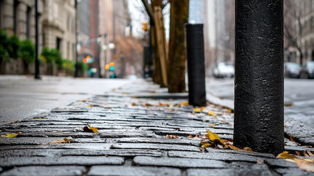 Low-angle shot of a wet cobblestone path in a city, scattered with autumn leaves, leading to blurred buildings. A black bollard stands prominently in the foreground.