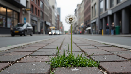 Resilient dandelion seedling in city sidewalk cracks