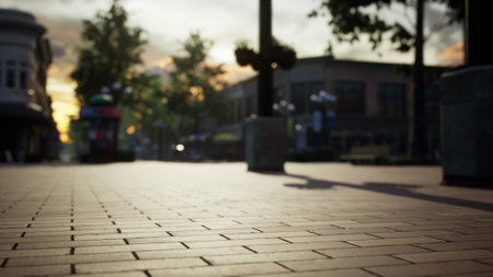 A tranquil urban sidewalk captured during sunset, highlighting the soft warm light, shadows, and architectural details, creating a serene atmosphere in the city.