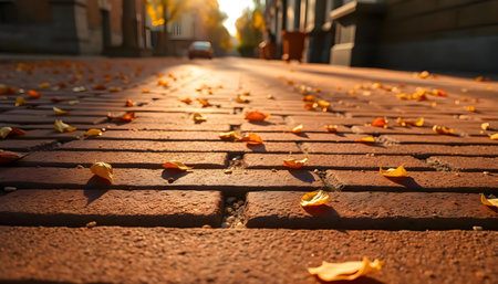 a brick road with leaves on the ground