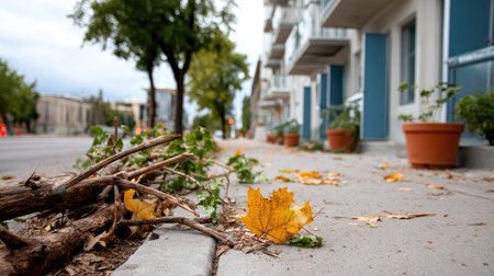 A serene urban scene featuring fallen yellow leaves and branches on a sidewalk, surrounded by modern apartments and greenery, symbolizing autumn's transition.