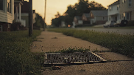 A serene suburban street view at dusk featuring a sidewalk bordered by grass and a drain cover, emphasizing quiet and tranquility in a residential area.