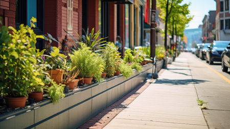 A tranquil urban sidewalk lined with beautiful flower planters basking in warm sunlight during the morning, creating a serene city atmosphere.