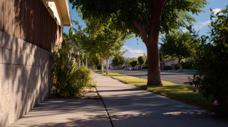 A serene sidewalk in a residential area, marked by shadows from trees and sunlight illuminating the pathway, creating a tranquil atmosphere ideal for strolls.