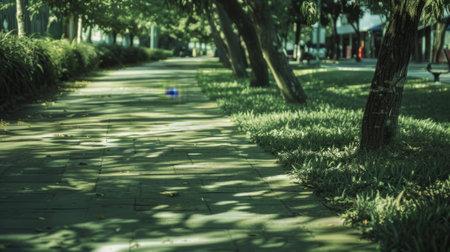 A serene pathway illuminated by gentle sunlight, flanked by vibrant grass, showcases the harmony between urban life and nature, inviting tranquil walks in the city.