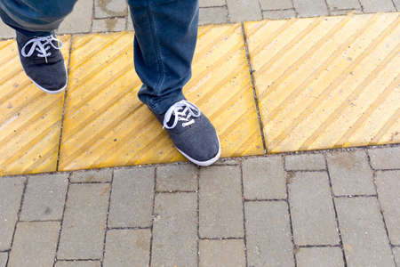 Men's feet on a bright yellow tactile coating for a visually impaired on the sidewalk. Infrastructure, assistive technology for people with disabilities