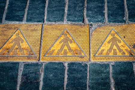 Marking the crosswalk. Yellow metal signs with a little man on gray asphalt.