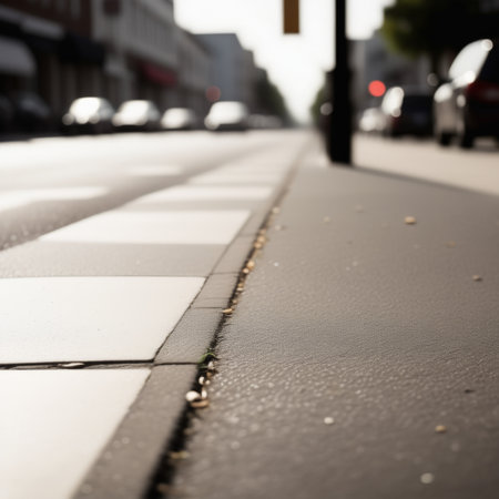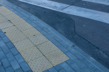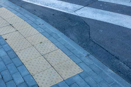 Urban pavement corner with textured tiles and asphalt road edge