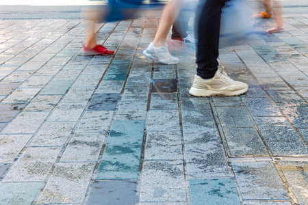Blurred motion of peoples legs walking on pavement with copy space