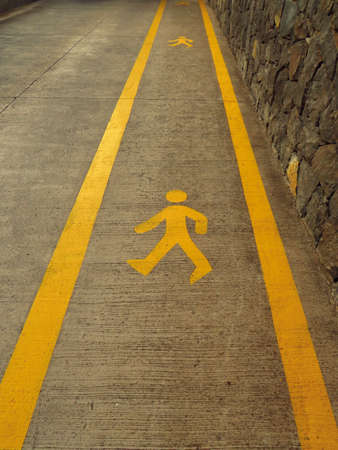 Background of Pedestrian sign on the walk way. Pedestrian crossing signal road paint. Pedestrian walking figure painted sign icon symbol in yellow paint on black asphalt sidewalk.