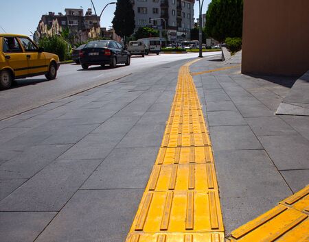 Colored concrete street sidewalk with yellow tactile lines for visually impaired people