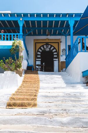 Sidi Bou Said, Tunisia - May 19, 2017: View of the street with white and blue architecture, traditional street cafe.