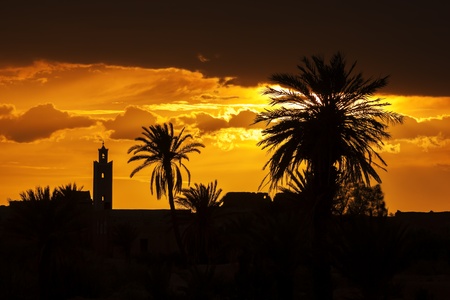 Sunset with mosque and date palm silhouettes, with dark clouds