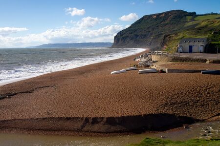 Boats on the pebble beach of the Jurassic Coast World Heritage Site in Sidmouth, Devon