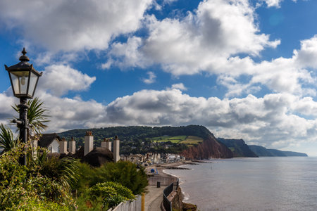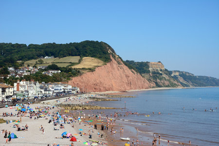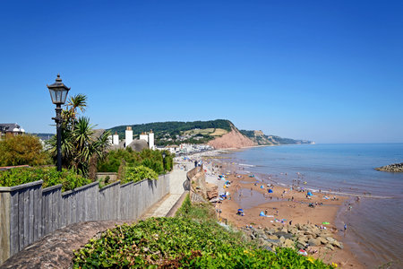 SIDMOUTH, UK - AUGUST 11, 2022 - Elevated view along the beach with views of the town and Pennington Point cliffs seen from Jacobs Ladder, Sidmouth, Devon, UK, Europe, August 11, 2022.